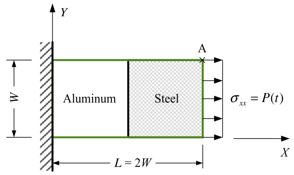 The domain consists of two materials: one half is steel and the other is aluminum. The material properties are: steel Young’s modulus E1 = 200 GPa, aluminum Young’s modulus E2 = 70 GPa, rho1 = 7860 kg/m3, rho2 = 2710 kg/m3, and the Poisson’s ratio of both parts is assumed null (nu1 = nu2 = 0) to impose 1D condition (props.txt).